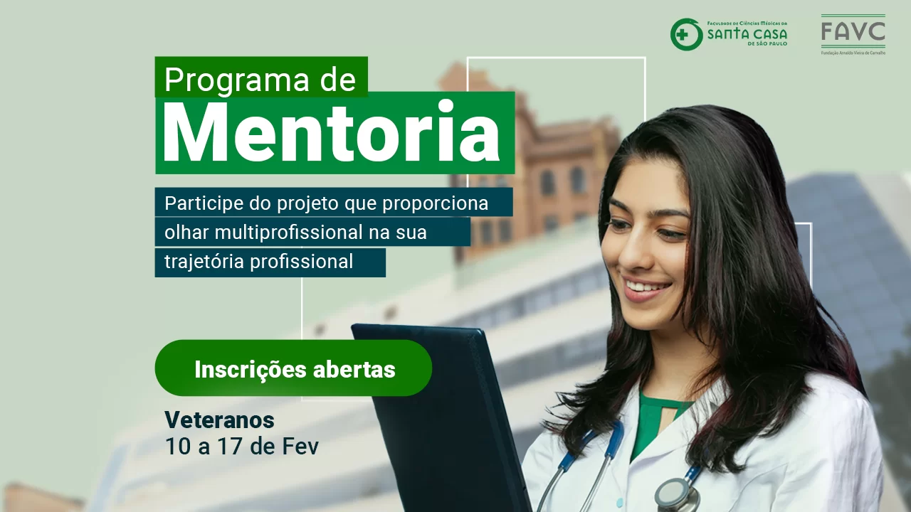 A Faculdade de Ciências Médicas da Santa Casa de São Paulo (FCMSCSP) abriu nesta quinta-feira (10/fev) as inscrições para o “Programa de Mentoria 2022”. Podem participar alunos de todos os cursos de graduação — Enfermagem, Fonoaudiologia, Medicina, Tecnologia em Radiologia e Tecnologia de Sistemas Biomédicos — , a partir do segundo semestre ou segundo ano, no caso do curso de Medicina. Para o curso de Enfermagem, poderão se inscrever somente os alunos matriculados a partir do 5º semestre.