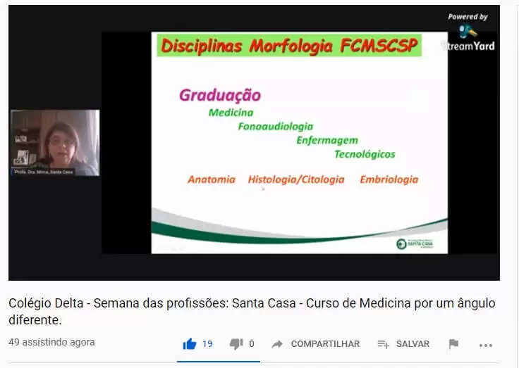 Como o VEM PRA SANTA físico, que promove a visita guiada de escolas de ensino médio e cursinhos à Faculdade de Ciências Médicas da Santa Casa de São Paulo (FCMSCSP), não é possível neste momento de pandemia, o Departamento de Comunicação e Marketing da instituição participou, dia 28/9/2020, da Semana das Profissões do Colégio Delta, realizando assim a 16ª edição do VEM PRA SANTA VIRTUAL, com a participação de 50 alunos da instituição.