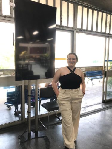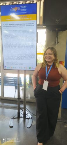 Além das alunas de graduação, egressos de Enfermagem também participaram do CBEN, entre eles foi Gabriela Marques Pineda. Na oportunidade, Gabriela apresentou o trabalho “Saúde mental de mulheres negras no ciclo gravídico puerperal”, desenvolvido em conjunto com as docentes Prof. Dra. Gislaine Eiko Kuahara Camiá e Prof. Dra. Luciane Régio Martins.