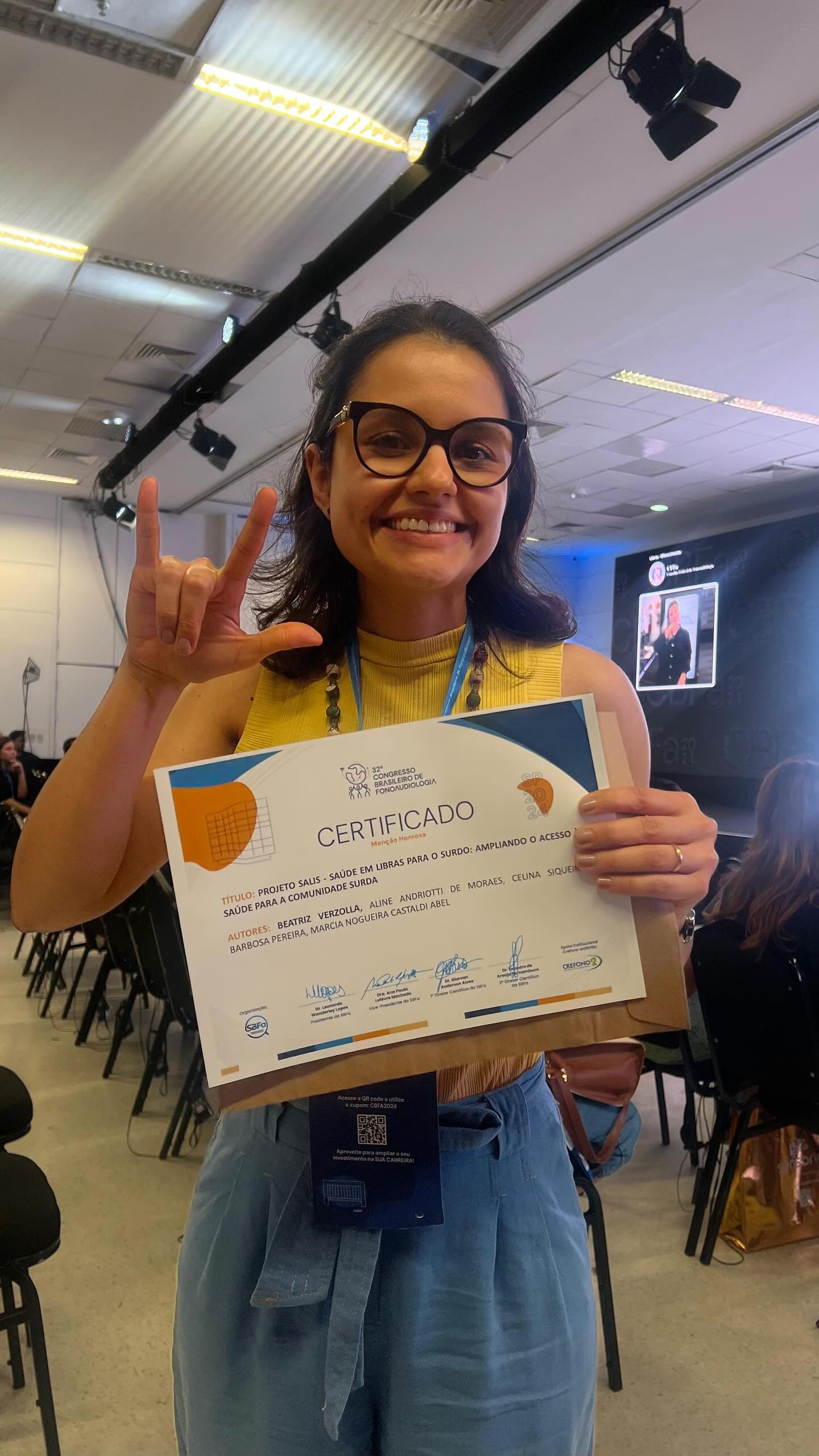 Na oportunidade, a Faculdade foi representada em apresentações de trabalho oral, por meio dos relatos de experiência sobre Fonoaudiologia sem Fronteiras, onde a Profª Dra. Beatriz Verzolla pode apresentar sobre o “Projeto Salis – saúde em libras para o surdo: ampliando o acesso à saúde para a comunidade surda”. Durante o evento, o Projeto Salis também recebeu menção honrosa devido à importante atuação que realiza à comunidade surda.