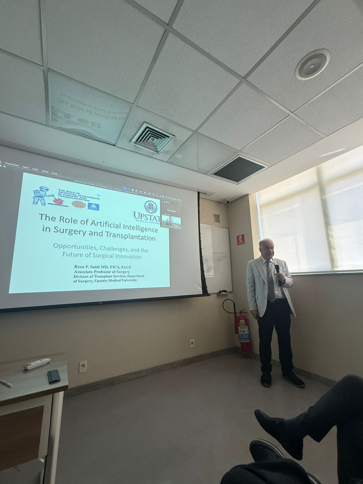 No dia 24 de outubro, a Faculdade de Ciências Médicas da Santa Casa de São Paulo (FCMSCSP) recebeu o renomado cirurgião internacional Dr. Reza F. Saidi para a palestra “O Uso da Inteligência Artificial em Cirurgia e Transplante”, voltada aos discentes e docentes do Programa de Pós-Graduação Stricto SensuPesquisa em Cirurgia da Instituição. A palestra fez parte da iniciativa da coordenação do Programa de Pesquisa em Cirurgia de ampliar a internacionalização do programa, buscando fortalecer parcerias internacionais no âmbito do ensino e da pesquisa.