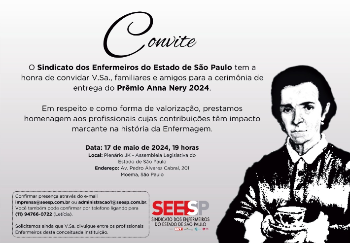 A solenidade para a entrega do Ato de Outorga do Prêmio Anna Nery 2024 foi promovida pelo Sindicato dos Enfermeiros do Estado de São Paulo (SEESP), em homenagem aos profissionais de enfermagem atuantes no estado de São Paulo.